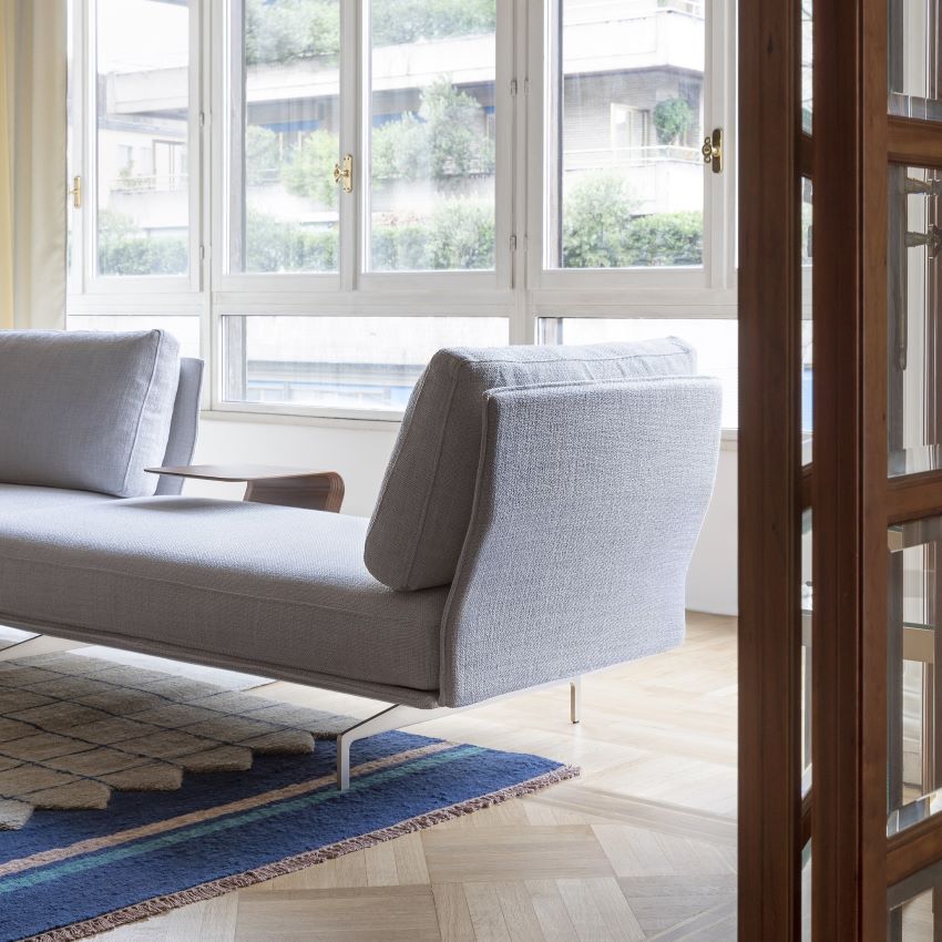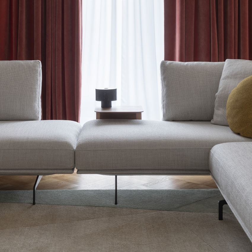 Questo prodotto è sfoderabile e in tessuto, mentre le sedute sono appoggiate su una base di metallo rivestito in tessuto o in pelle, sollevato da terra su piedi in metallo cromo satinato o verniciato.