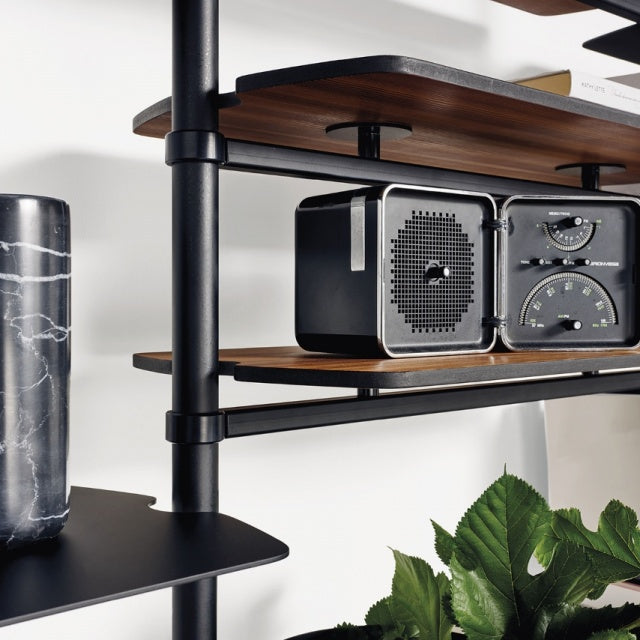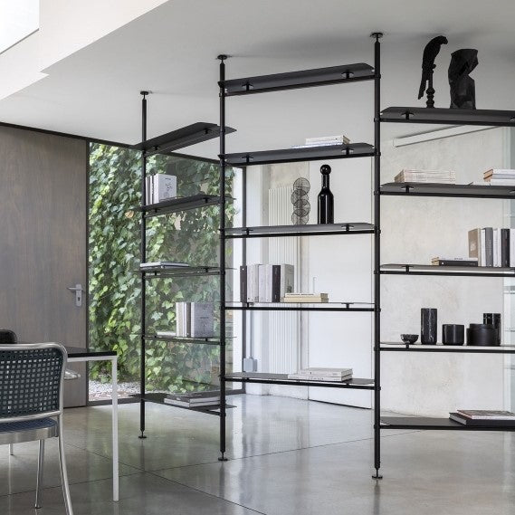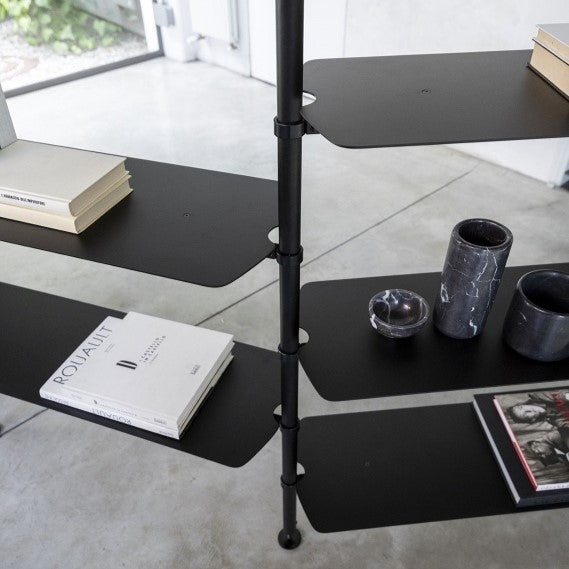 La libreria Levante di Mogg è un mobile modulare progettato per offrire uno spazio espositivo elegante e funzionale. Realizzata in metallo verniciato nero opaco, questa libreria presenta ripiani di diverse dimensioni e altezze che permettono di organizzare libri, oggetti decorativi e collezioni in modo creativo.
