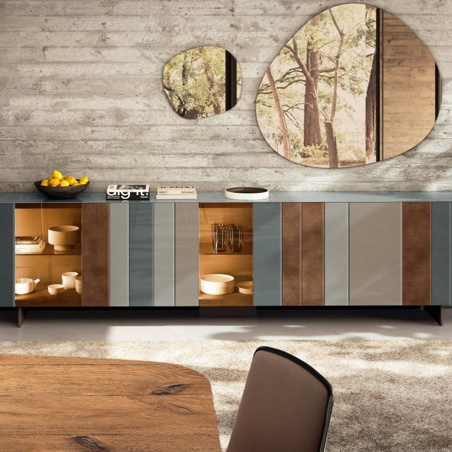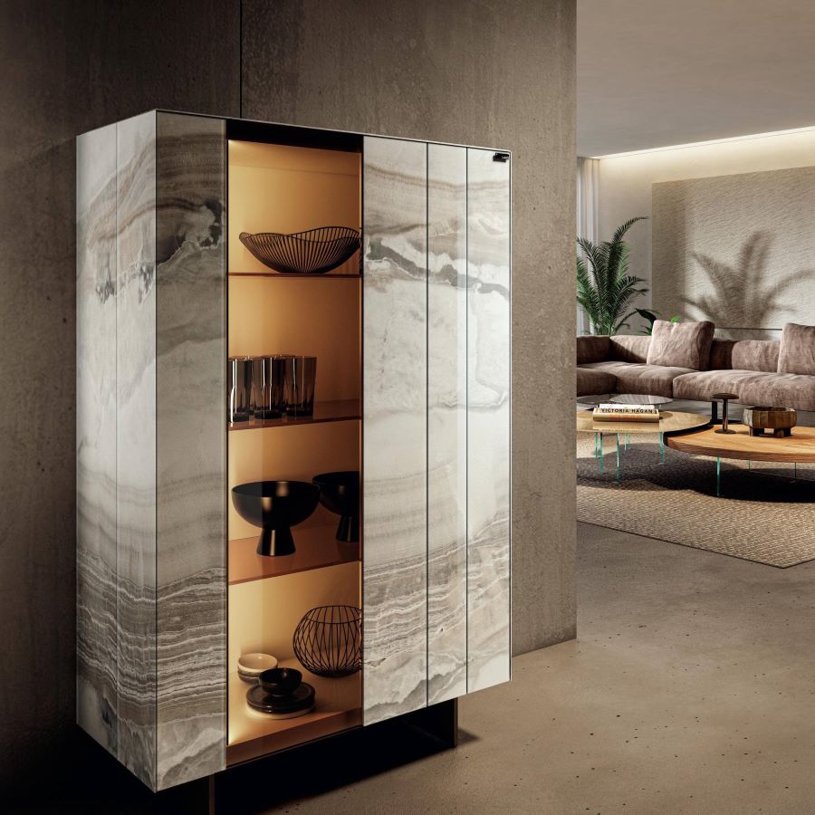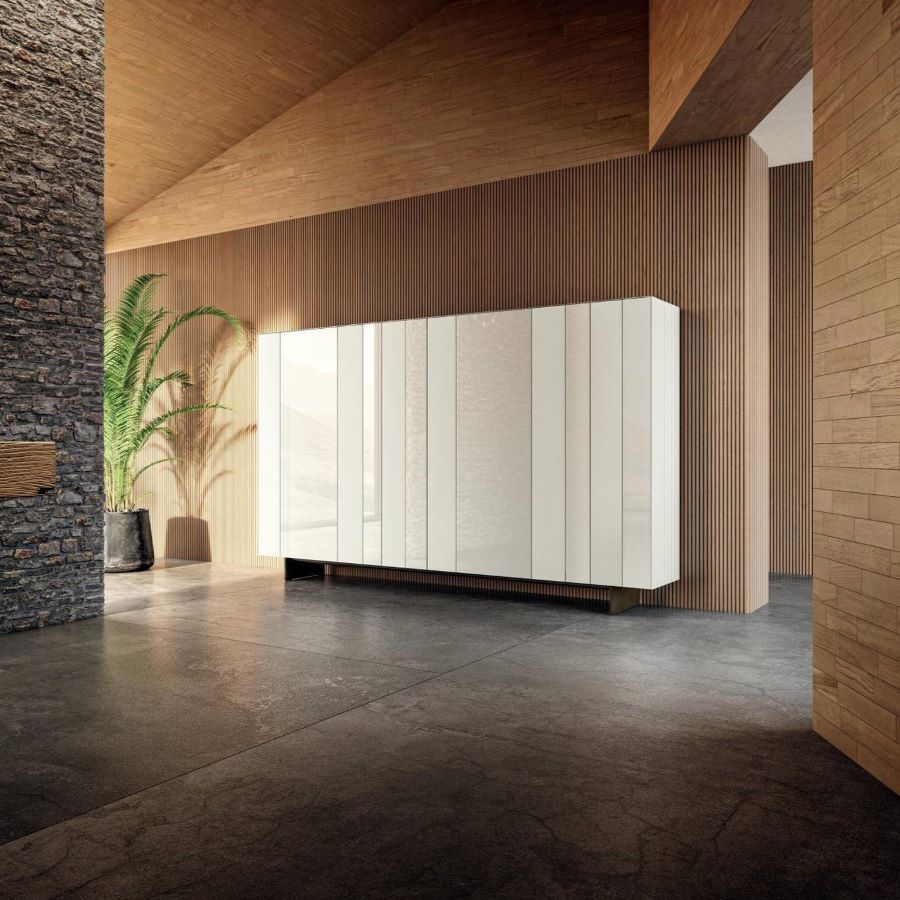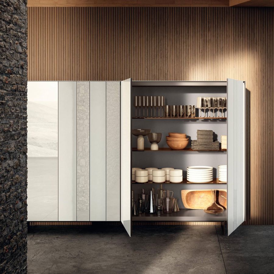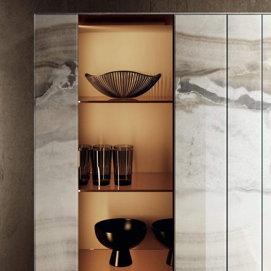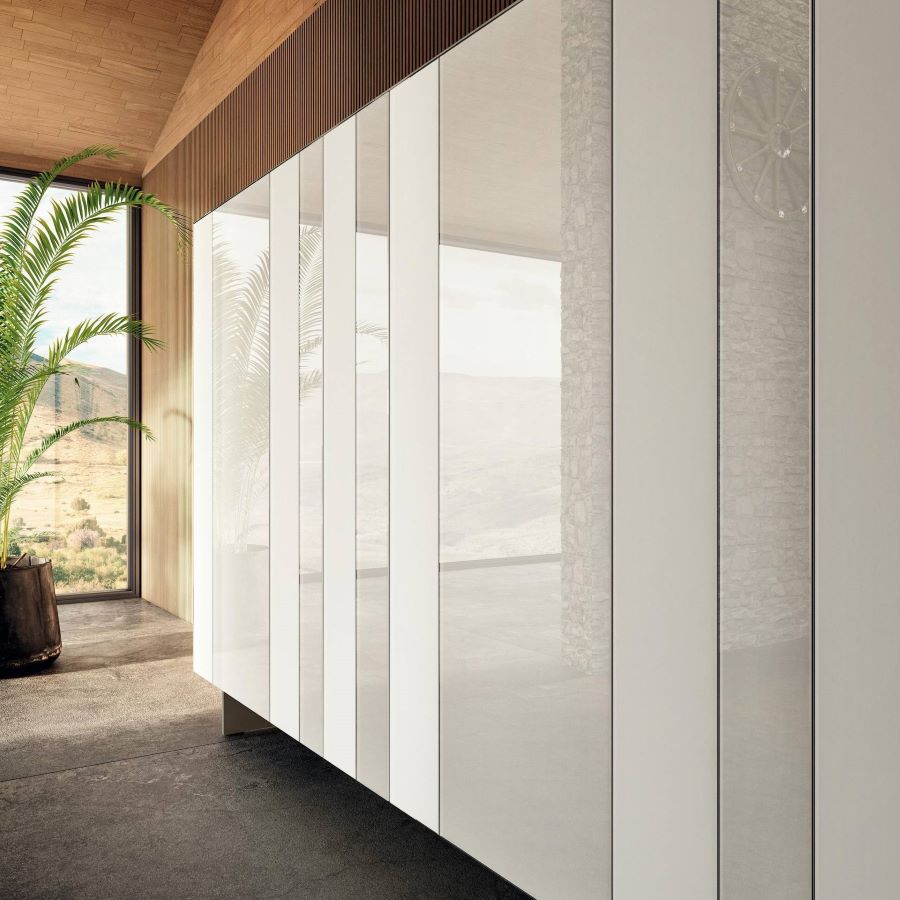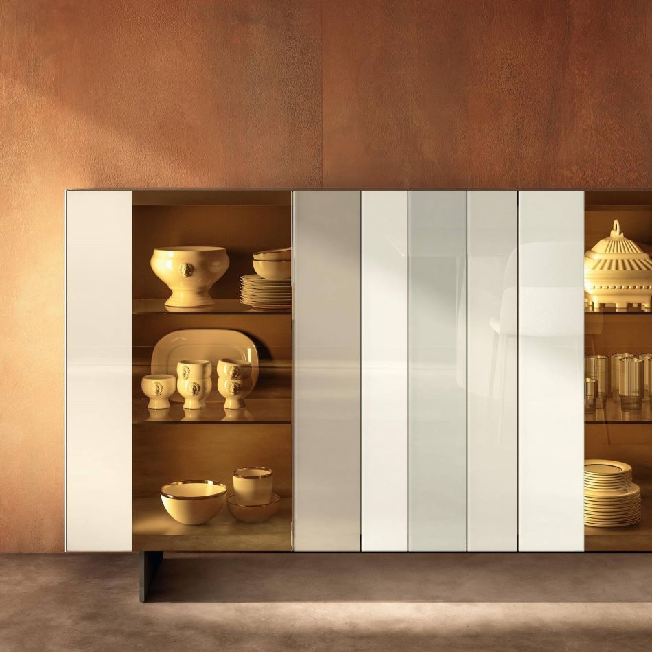 La possibilità di personalizzare ogni singola fascia permette di generare infiniti mood cromatici. Le ante in vetro trasparente bronzato, lavorate a 45° e integrate senza elementi di supporto visibili, sono enfatizzate da un sistema di illuminazione, che valorizza e dona calore all'oggetto custodito. Soluzioni contenitive con dimensioni ogni 20 cm di larghezza e 4 altezze, per tutte le aree della casa.