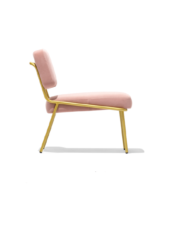Poltroncina lounge con struttura in metallo e seduta in tessuto.