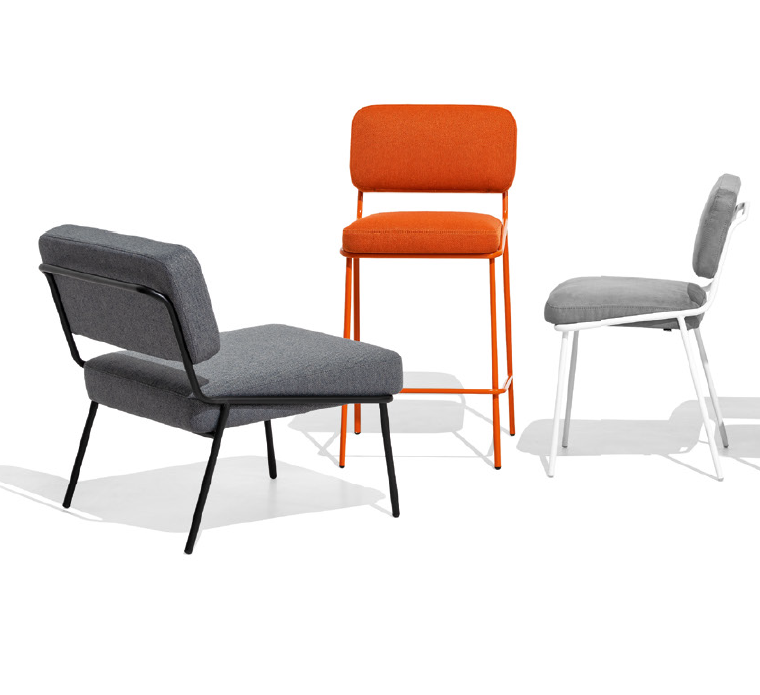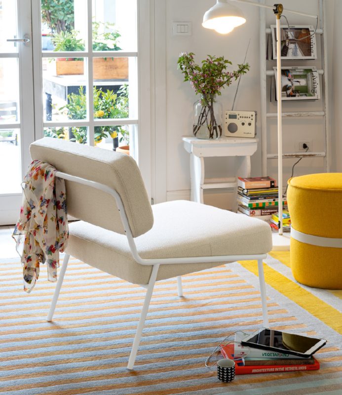 La struttura è formata da quattro sottili gambe in metallo verniciato che sostengono un elegante scocca rivestita completamente in tessuto, disponibile in più colorazioni. Sixty Lounge è disponibile anche in diversi tessuti.