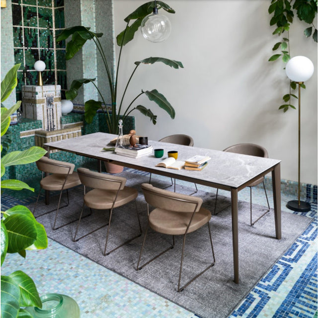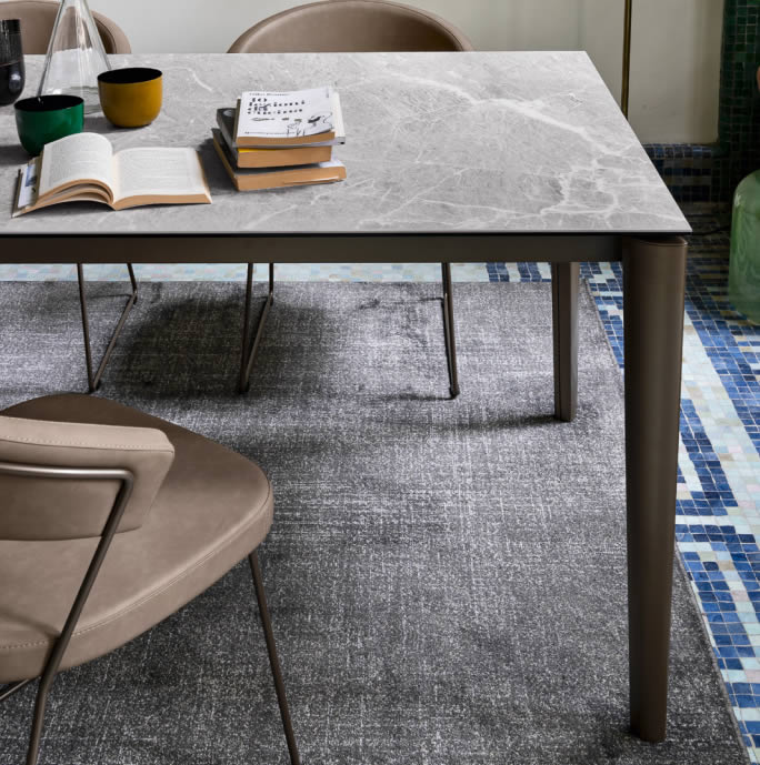 Con le sue linee a sezione arrotondata in metallo verniciato e la varietà di scelta per il piano, questo tavolo si adatta perfettamente a diverse esigenze di spazio e stile, offrendo un'esperienza di dining confortevole e di classe. Piano disponibile in ceramica con allunghe in legno nobilitato o interamente in legno nobilitato, struttura disponibile in diversi metalli.