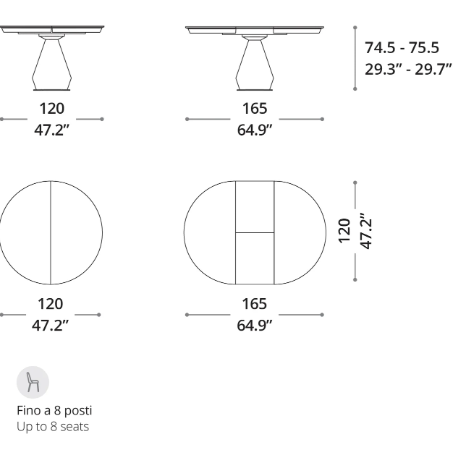 - Dimensioni: da chiuso diametro 120 cm; aperto: 165 x 120 cm. Altezza H. 74-5 -75.5 cm.
