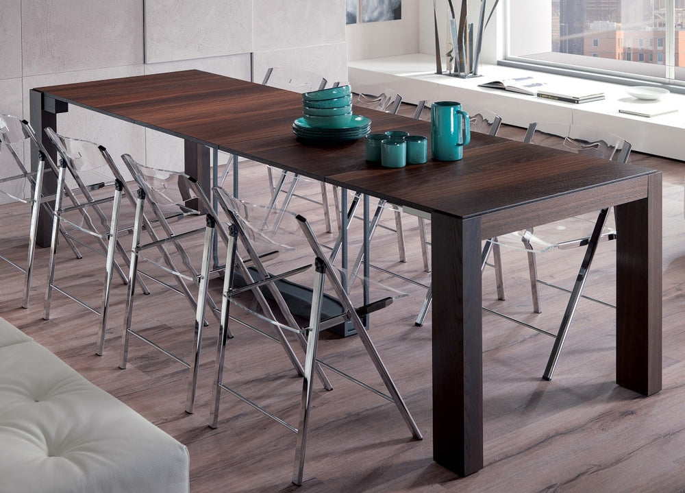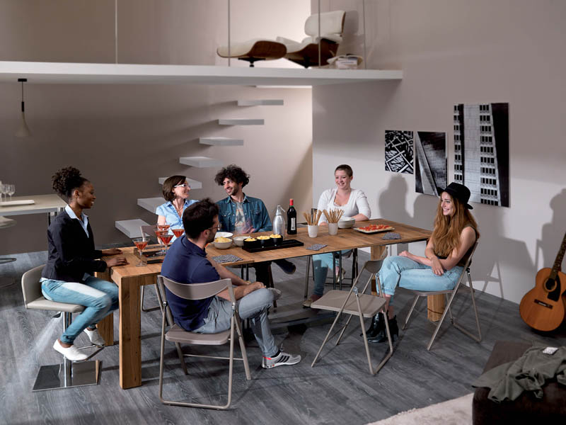 Diventa un tavolo da pranzo fino a 12 posti ed è disponibile in legno, in molteplici finiture.