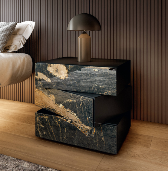 Morgana è disponibile in diverse finiture di pregio, tra cui legni materici, vetro laccato e finiture materiche di grande impatto visivo, permettendo ampie possibilità di personalizzazione in base al contesto d’arredo e allo stile della camera da letto. Le combinazioni cromatiche e materiche consentono di creare soluzioni armoniose con gli altri elementi della zona notte.