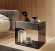 Il comodino è disponibile in diverse varianti di vetro, incluse soluzioni lucide, opache o con finiture materiche che arricchiscono il progetto con texture preziose e personalizzabili secondo lo stile desiderato.