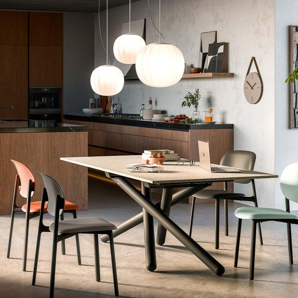 Le gambe tubolari crea un design dinamico e stabile su cui poggia un piano essenziale in ceramica, disponibile in più finiture.