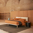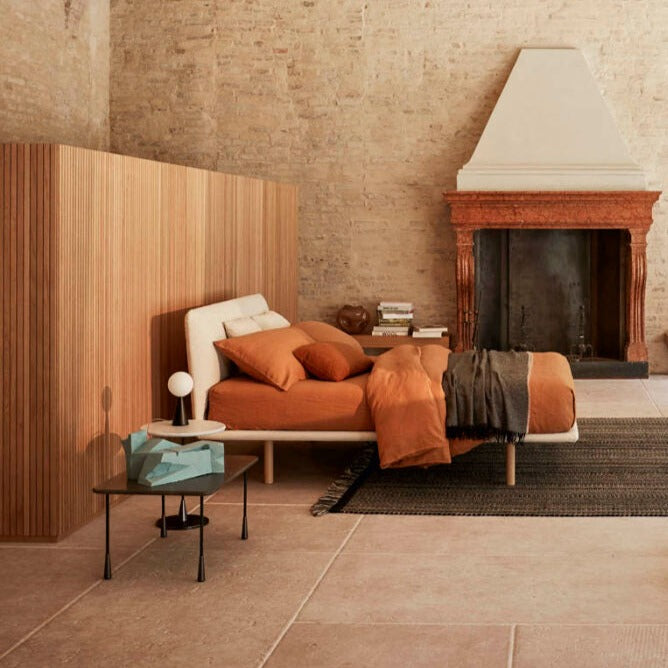 Design minimale e dimensioni contenute si traducono in capacità ad adattarsi con discrezione ed eleganza ad ogni ambiente. Come un filo continuo, testiera e giroletto, interamente rivestiti, disegnano un’unica forma senza interruzioni.