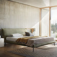 Abbiamo rivestito un telaio leggero, con le giuste proporzioni, e lo abbiamo integrato alla testata con una confezione unica collegata da cuciture invisibili. Il materasso galleggia da terra con la sua esile ma robusta struttura sostenuta da sottili piedi in metallo.