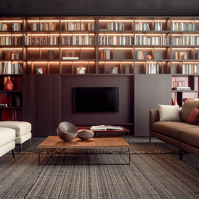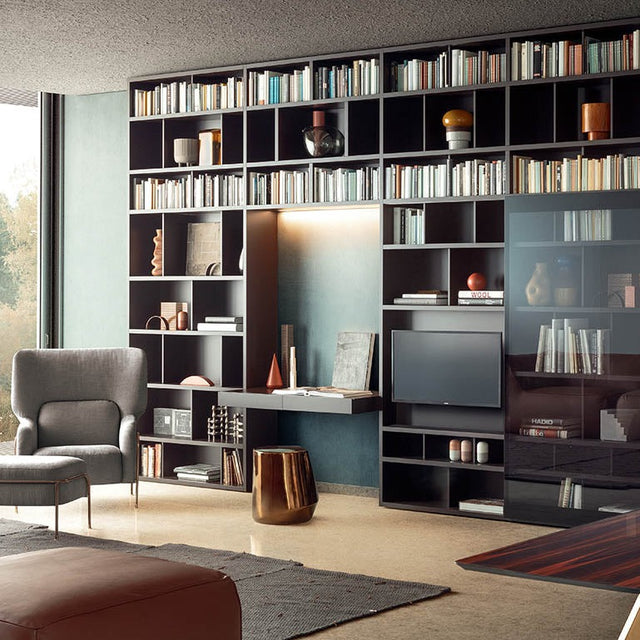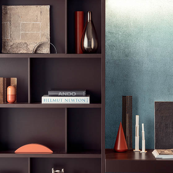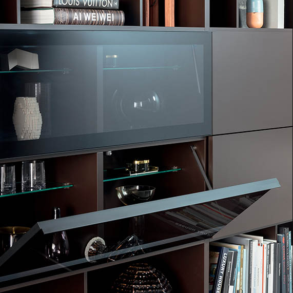 Disporre di uno spazio personalizzato per ogni cosa, scandire accostamenti, bilanciare pieni e vuoti: Spazioteca è sintesi tra ordine, ritmo e proporzione. Il concetto classico di libreria si apre a nuove versatili possibilità, in grado di accogliere oggetti, libri, monitor tv, suddividere gli ambienti della casa ed integrare soluzioni home office. E’ il primo sistema modulare con fianchi, ripiani, schiene e divisori con passo 1 cm di serie, e vani liberi da fori e ferramenta. Caratteristica comune ad ogni composizione è il design dinamico e leggero, su misura per ogni esigenza.