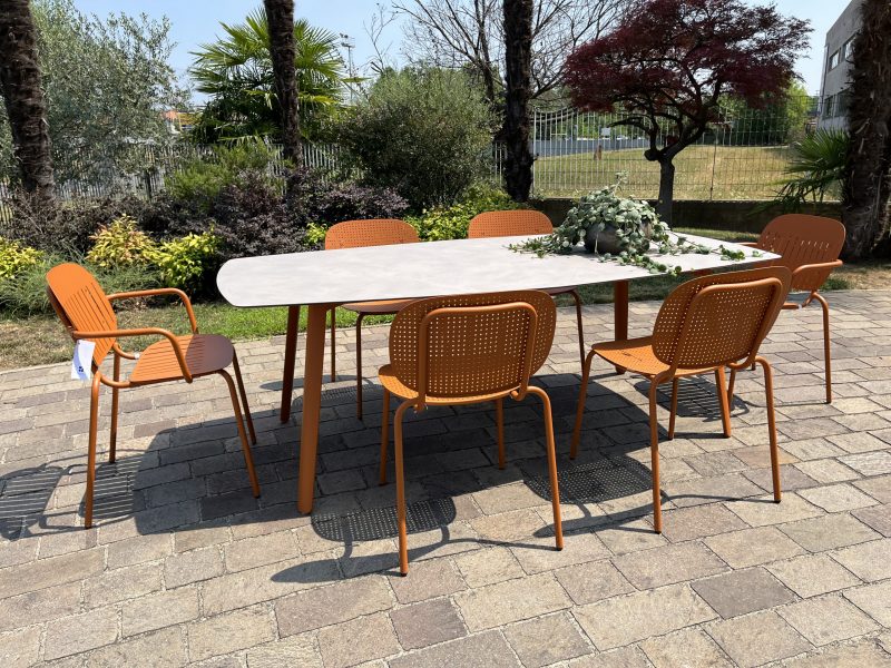 Si-Si Dots è una sedia impilabile realizzata completamente in acciaio, con una struttura tubolare e una scocca traforata in lamiera zincata e verniciata terracotta.