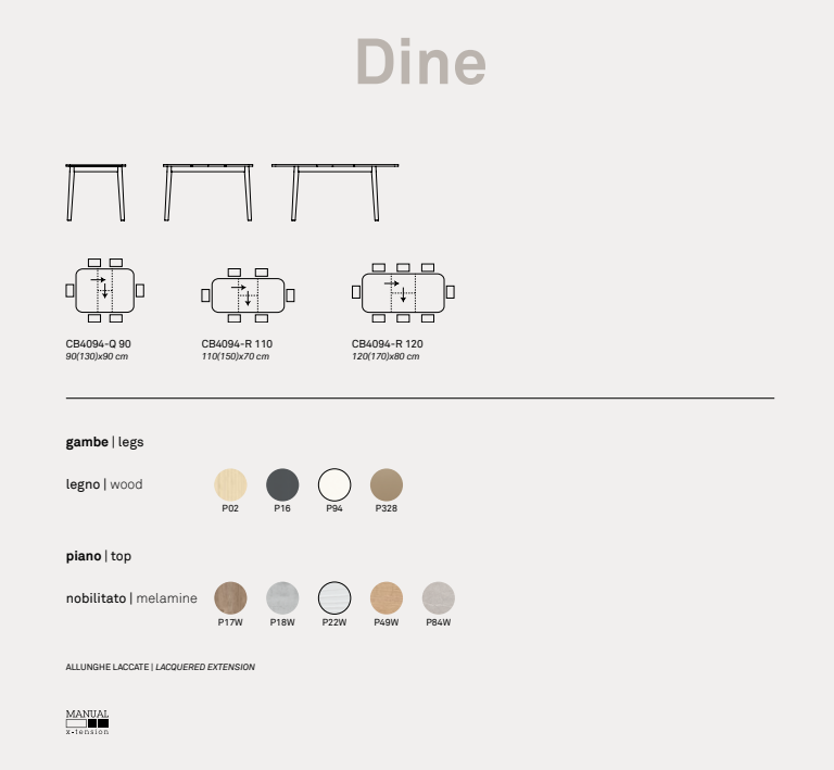 Il piano del tavolo è in eco legno ha una misura di partenza di 90 centimetri, grazie alla sua allunga a libro integrata nel piano raggiunge 130 centimetri. Il tavolo quadrato allungabile Dine 90x90 cm di Connubia è disponibile in diversi colori: legno bianco, rovere naturale, legno effetto pietra e molti altri.