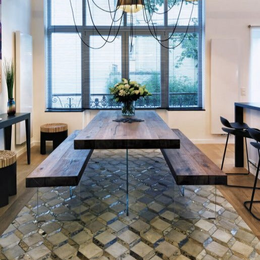 Grazie alla struttura in vetro, sembra fluttuare nell'aria dando un senso di leggerezza all'ambiente. Il legno della seduta di spessore 8 cm è un rovere centenario lavorato artigianalmente, caldo e ricco di venature, disponibile in legno Wildwood naturale, grigio o scuro. La panca Air Wildwood può ospitare da 2 a 5 persone.