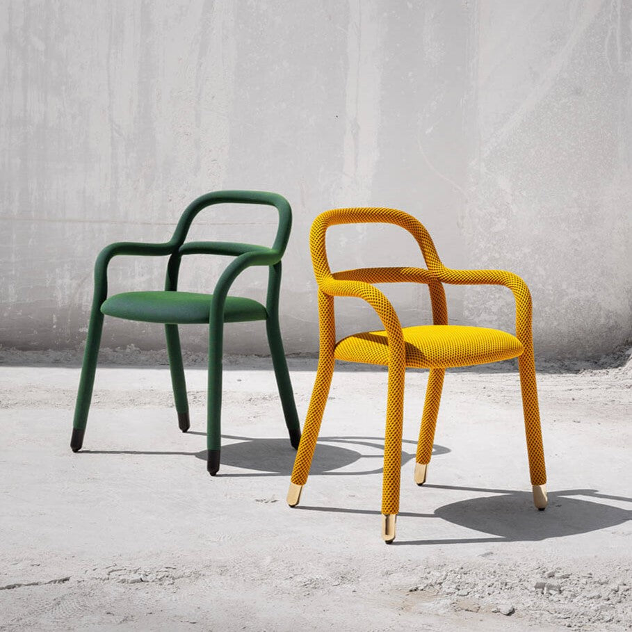 Sedia rivestita in tessuto con piedini in metallo e braccioli. Scrivici per un preventivo personalizzato