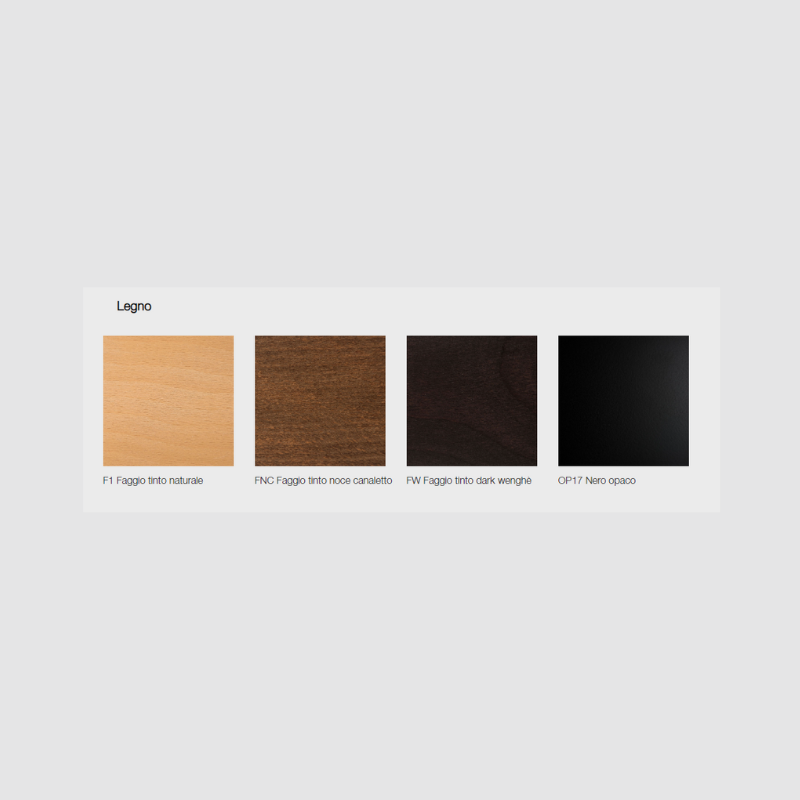 La struttura interna è in acciaio verniciato a polveri epossidiche, mentre le gambe sono in legno massello.