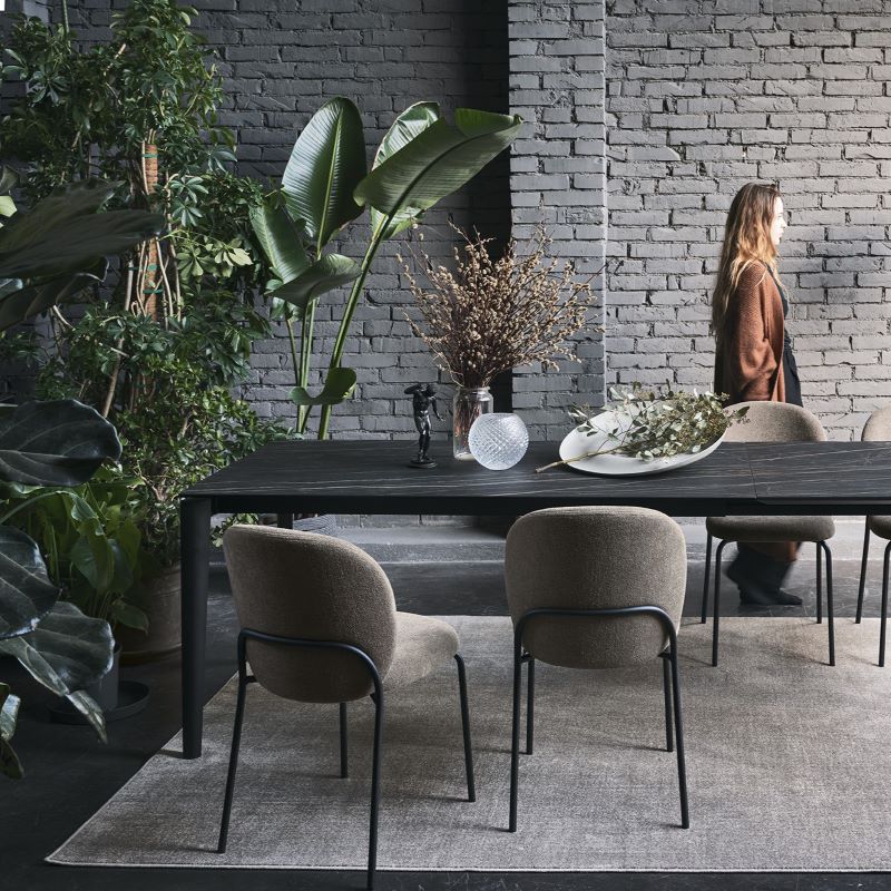 La struttura è disponibile in metallo nero opaco, metallo lava opaco o metallo canapa opaco, mentre la seduta imbottita è acquistabile in diversi tessuti.