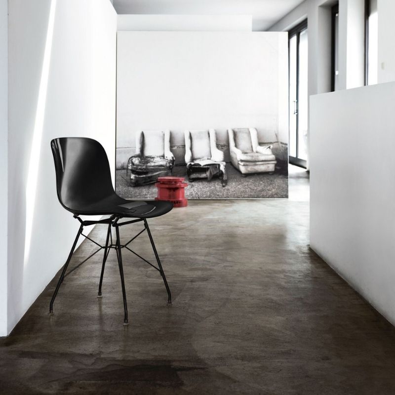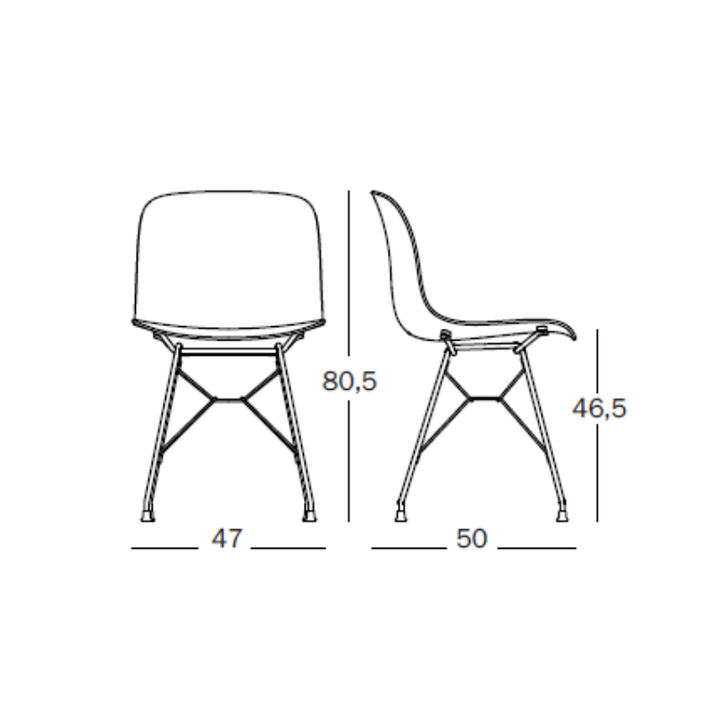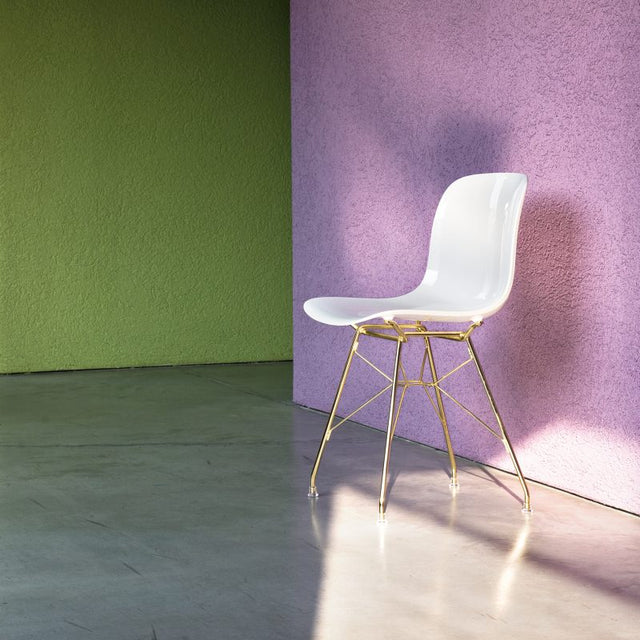 Costituita da una base in tondino d'acciaio cromato o verniciato, con un telaio a formare un gioco geometrico, e da una monoscocca interamente in polipropilene.