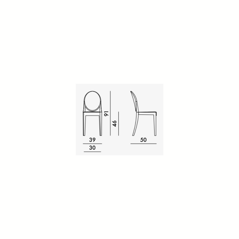 Victoria Ghost è costituita da policarbonato in un unico stampo ad iniezione, un materiale resistente agli urti e agli agenti atmosferici che la rende, quindi, adatta sia ad un utilizzo indoor sia outdoor. Il carisma e la personalità di Victoria Ghost si evincono dal suo design che ha le basi nelle linee classiche, con uno schienale arrotondato che ricorda la forma di un antico medaglione, sostenuto da una seduta, invece, lineare e geometrica. Disponibile in diverse colorazioni.