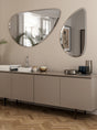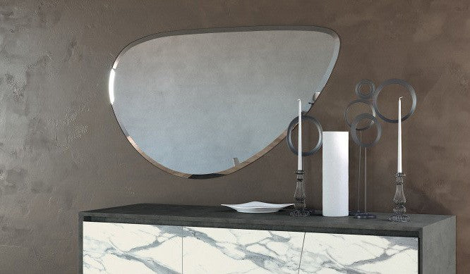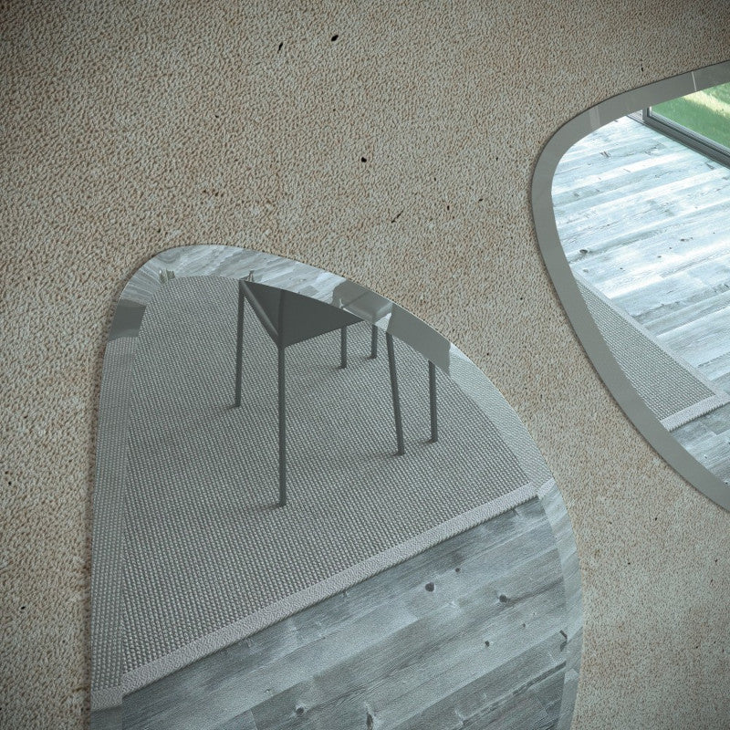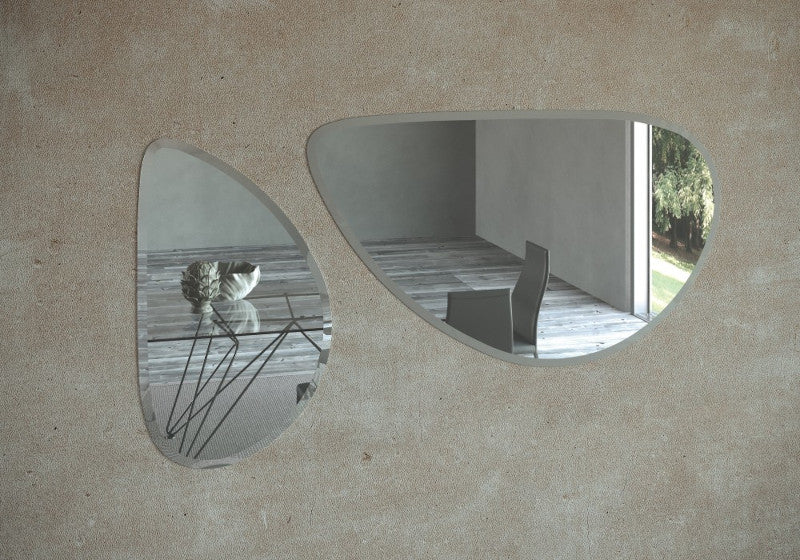 Specchio sagomato e bisellato in cristallo trasparente neutro.