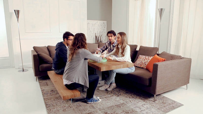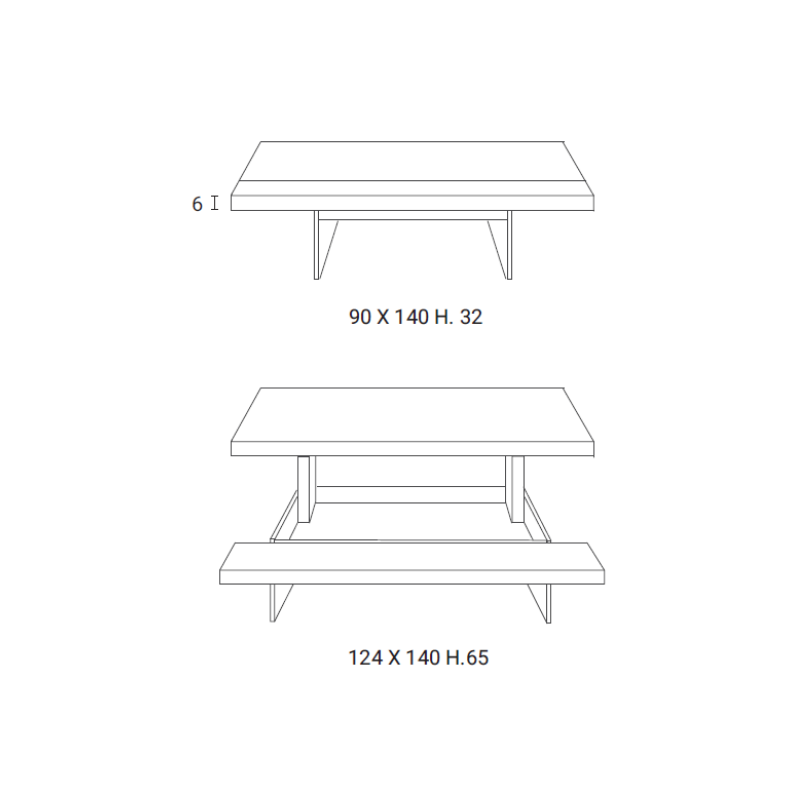 Markus è un tavolino elevabile, a due altezze, grazie ad un meccanismo di sollevamento a gas auto-frenante. Una volta sollevato parte del piano diventa una panca.