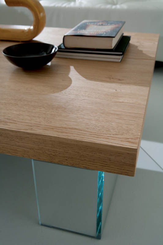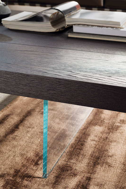 Questo prodotto ha un piano rettangolare in legno, gambe in cristallo trasparente o fumé e struttura in metallo verniciato grafite opaco.