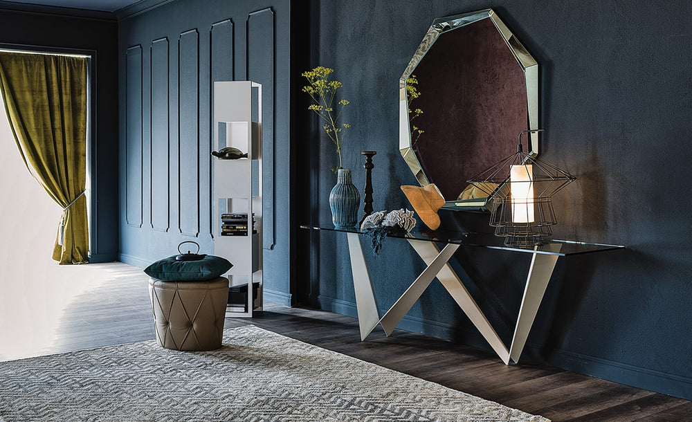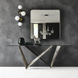 Westin di Cattelan è una consolle fissa di design con piano in cristallo trasparente caratterizzata da una struttura in acciaio ad elementi incrociati.
