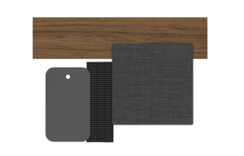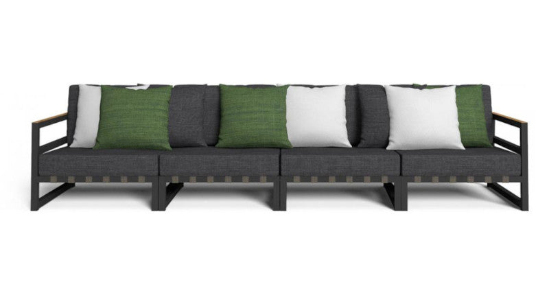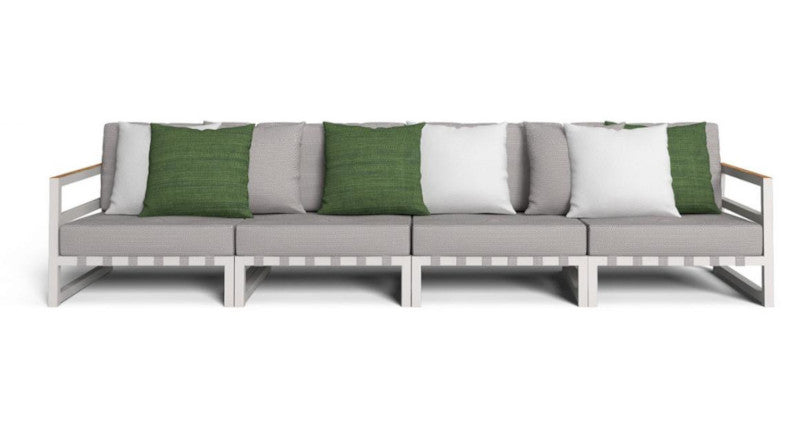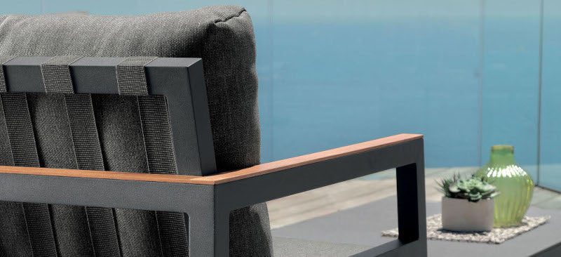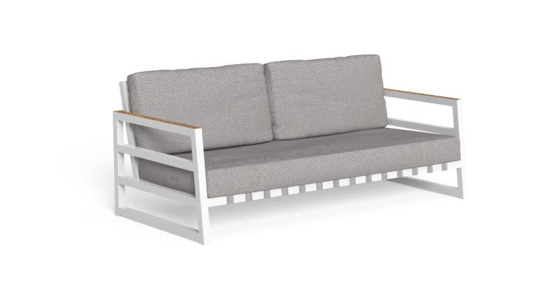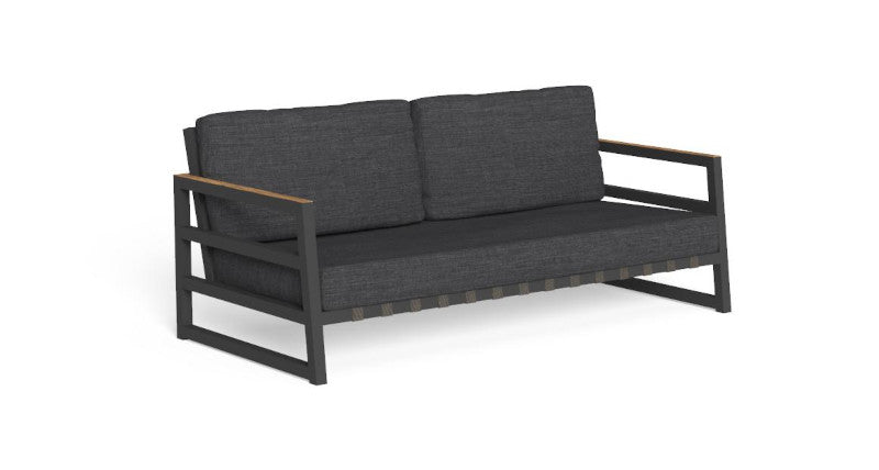 La comodità del divano è data dalla struttura in alluminio verniciato a polvere con un listello in teak sul lato superiore dello schienale e dei braccioli. La seduta è realizzata con cinghie elastiche sintetiche specifiche per esterni. La cuscineria presenta un tessuto sfoderabile, facile da lavare e resistente agli agenti atmosferici con un'imbottitura in quick dry foam.