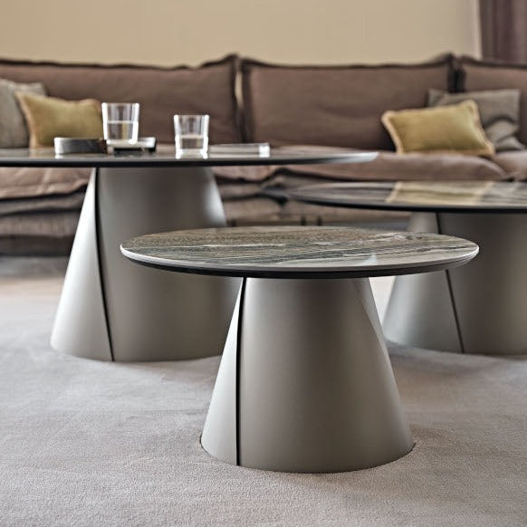 Tavolini con base conica in metallo goffrato e piano in ceramica | VIENI A VEDERLI IN SHOWROOM