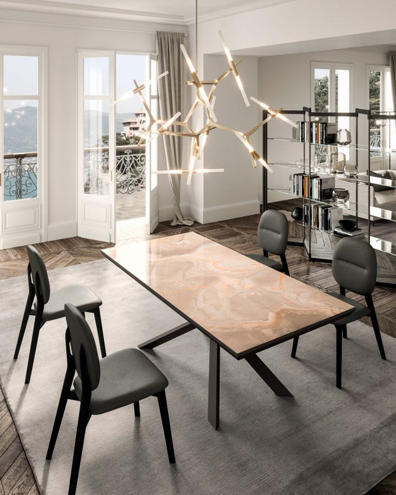Un tavolo da pranzo con base in metallo, piano e allunghe disponibili in legno, cemento o Marble Glass. Ma non è questa la sua peculiarità.