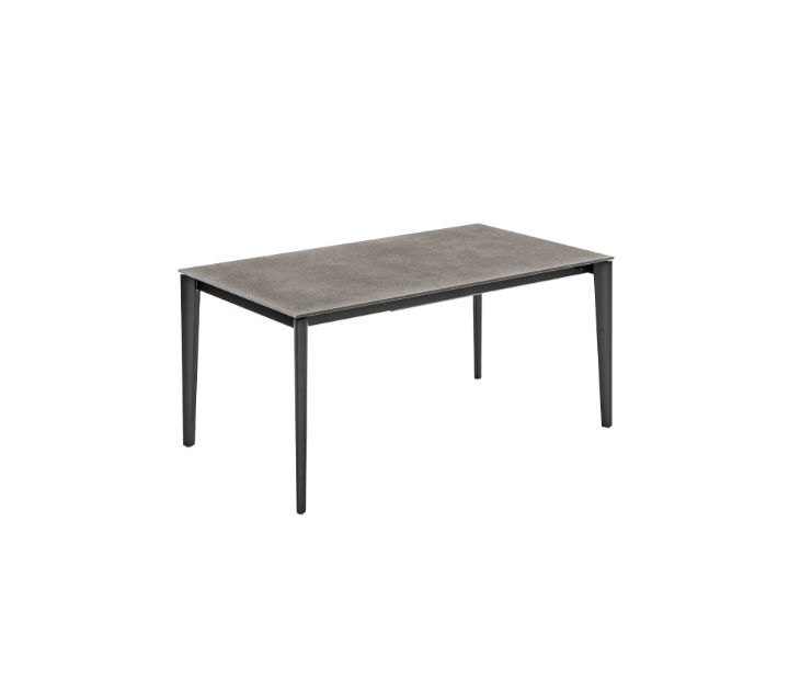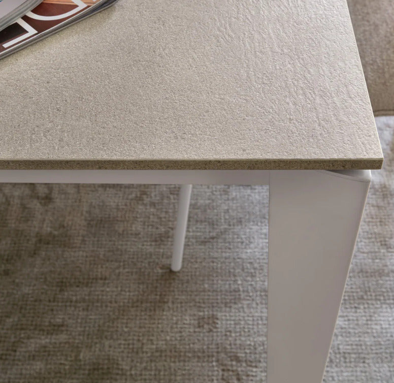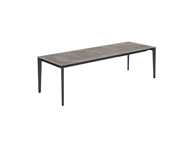 Tavolo allungabile con piano in ceramica o in legno nobilitato e due allunghe incorporate.