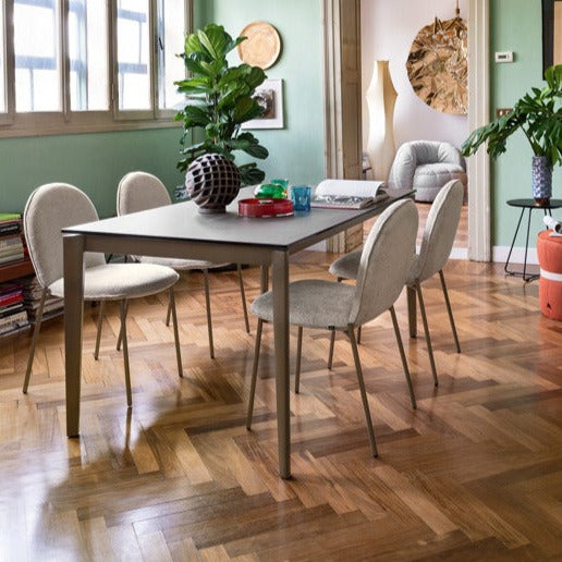 Con le sue linee a sezione arrotondata in metallo verniciato e la varietà di scelta per il piano, questo tavolo si adatta perfettamente a diverse esigenze di spazio e stile, offrendo un'esperienza di dining confortevole e di classe. Piano disponibile in ceramica con allunghe in legno nobilitato o interamente in legno nobilitato, struttura disponibile in diversi metalli.