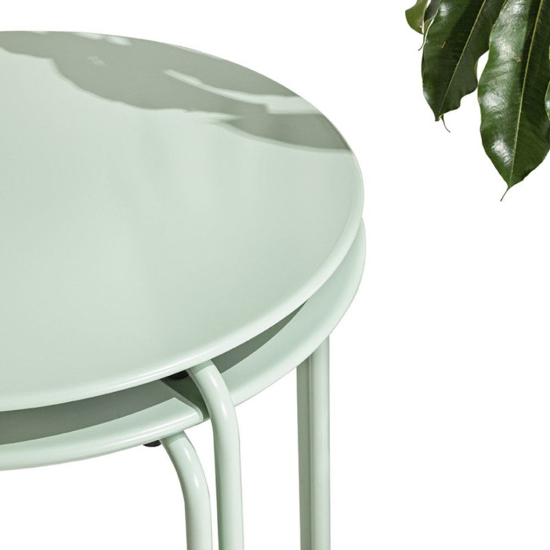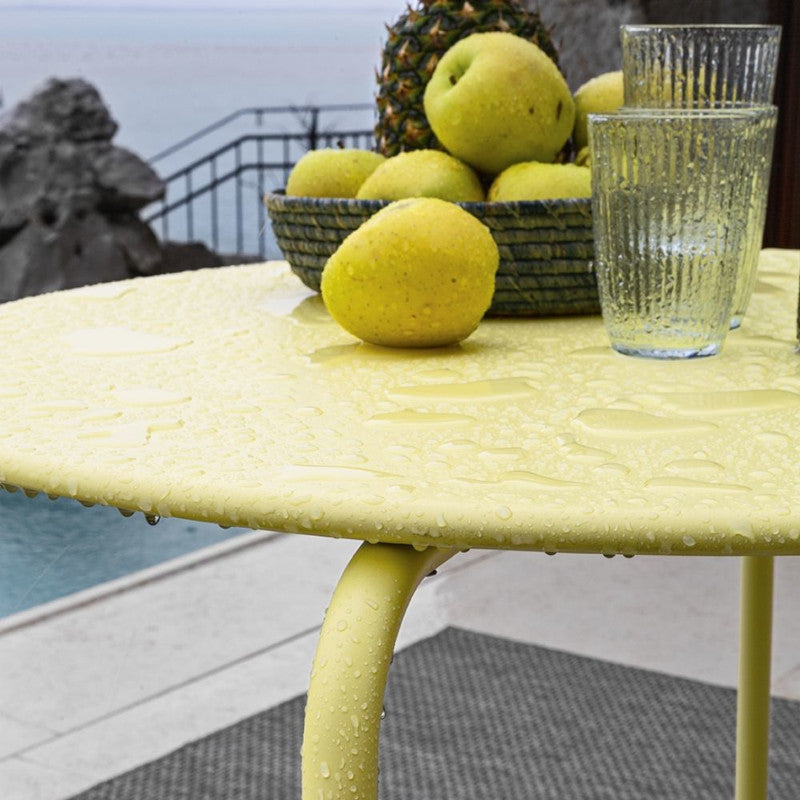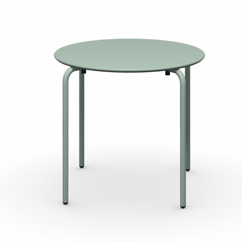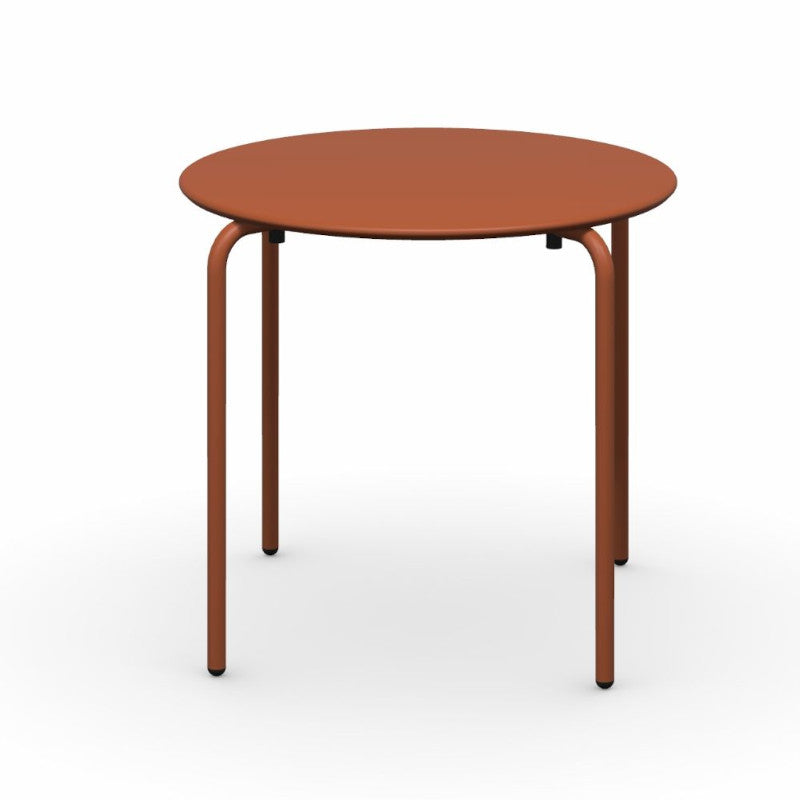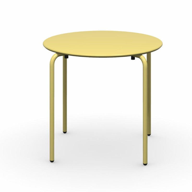 Tavolo impilabile in metallo trattato per uso esterno, disponile in più colorazioni.