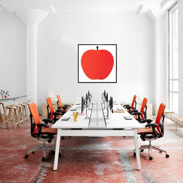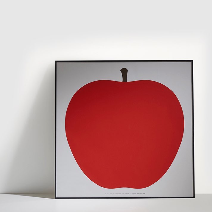 Di queste opere non esistono originali, perché l’immagine finale si ottiene solo attraverso i procedimenti tecnici di riproduzione (serigrafia) Mari sembra cercare attraverso la scelta di questi soggetti ‘archetipi’, la forma e la tecnica della loro rappresentazione una sorta di ‘super-icona’: la Mela non è una mela ma La Mela.