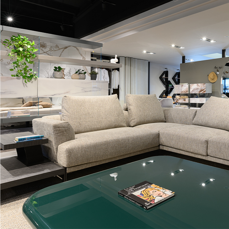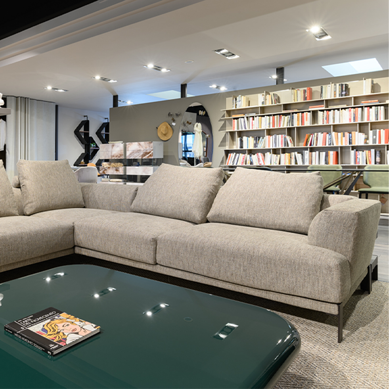 Le piattaforme autonome, sia rigide che morbide, si combinano le une con le altre in composizioni che potrebbero estendersi quasi in ogni direzione, per andare a soddisfare i vari bisogni della vita domestica. I complementi, dal disegno atemporale, si ispirano a valori artigianali, combinando essenze e marmi, creando giustapposizioni disinvolte. Questi elementi, accostabili tra loro e integrabili alle componenti imbottite, ispirano un libero gioco di creatività architettonica che ne rafforza l'effetto di articolata linearità. Le dolci volumetrie dei braccioli e dello schienale si espandono leggermente verso l'esterno, conferendo un senso di gradevole accoglienza.