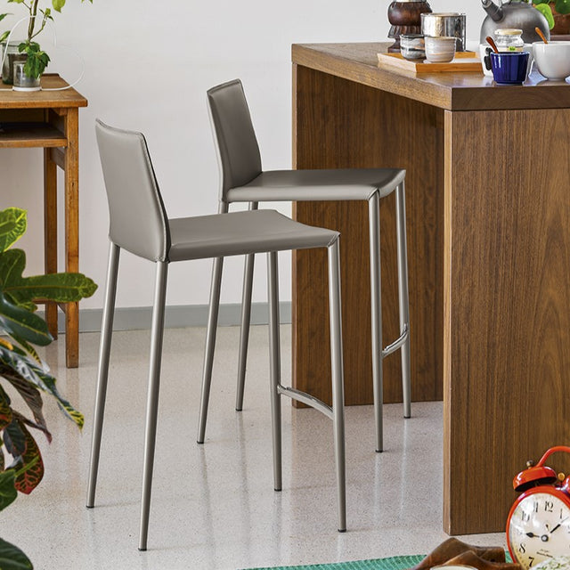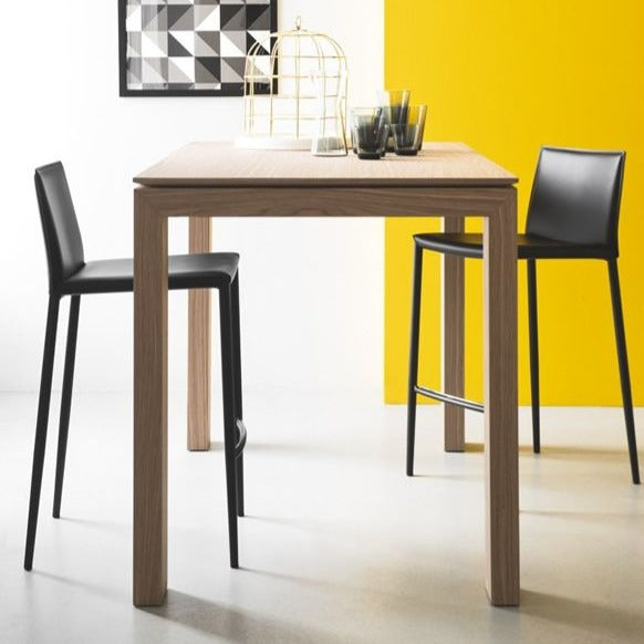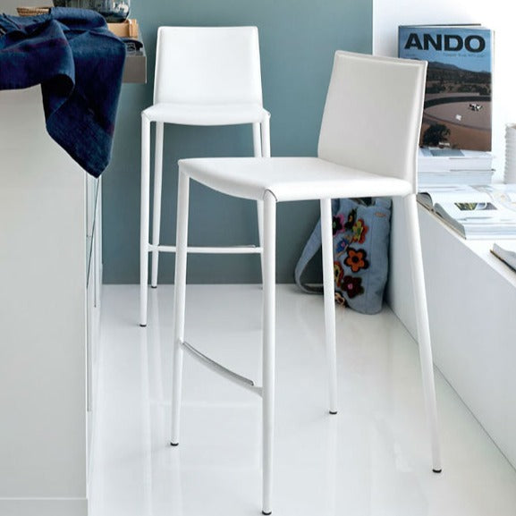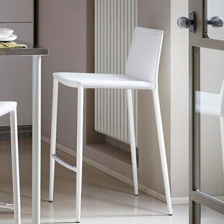 Le cuciture a vista impreziosiscono la seduta. Consigliata per completare la penisola in cucina oppure in un lounge bar.
