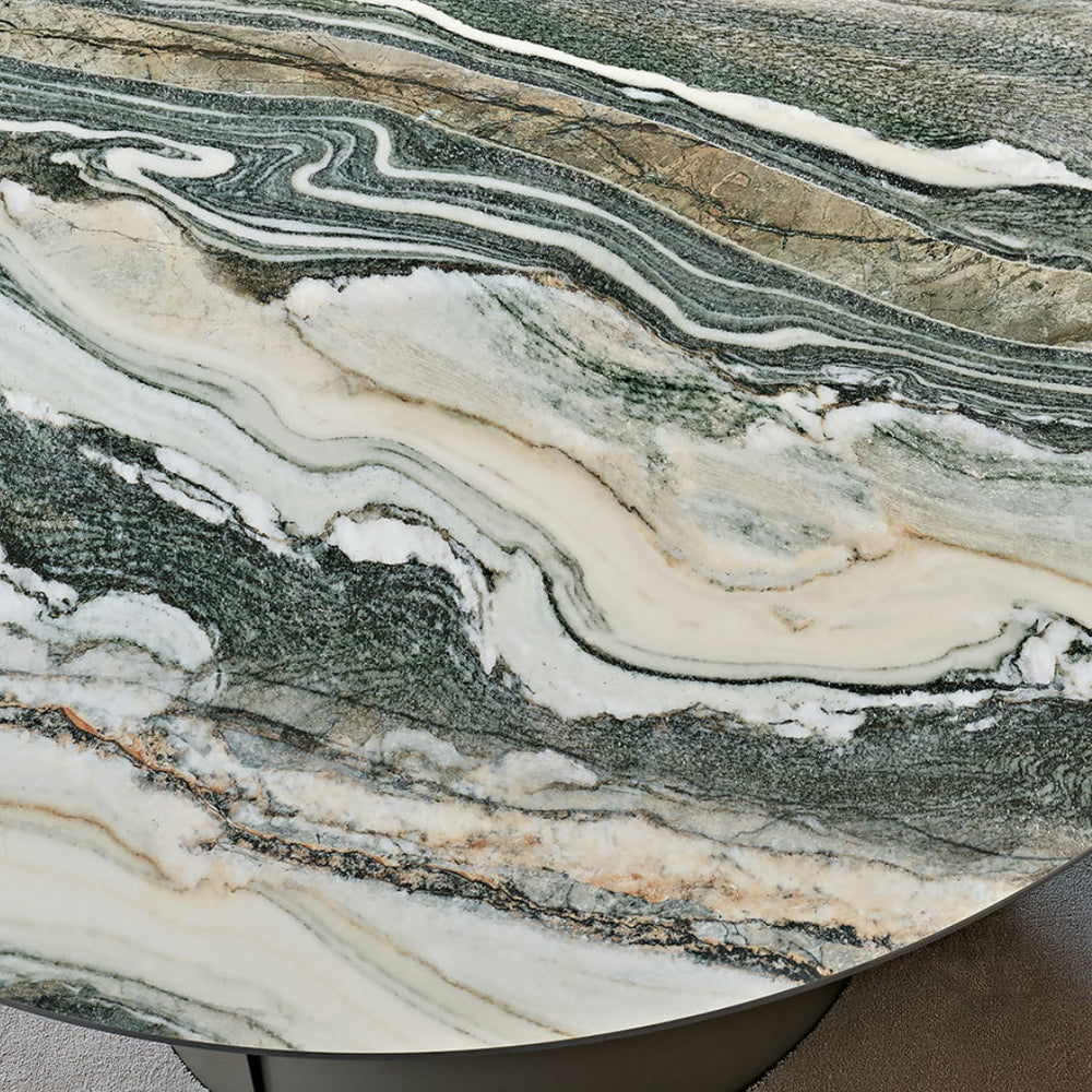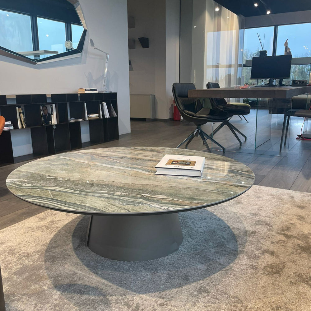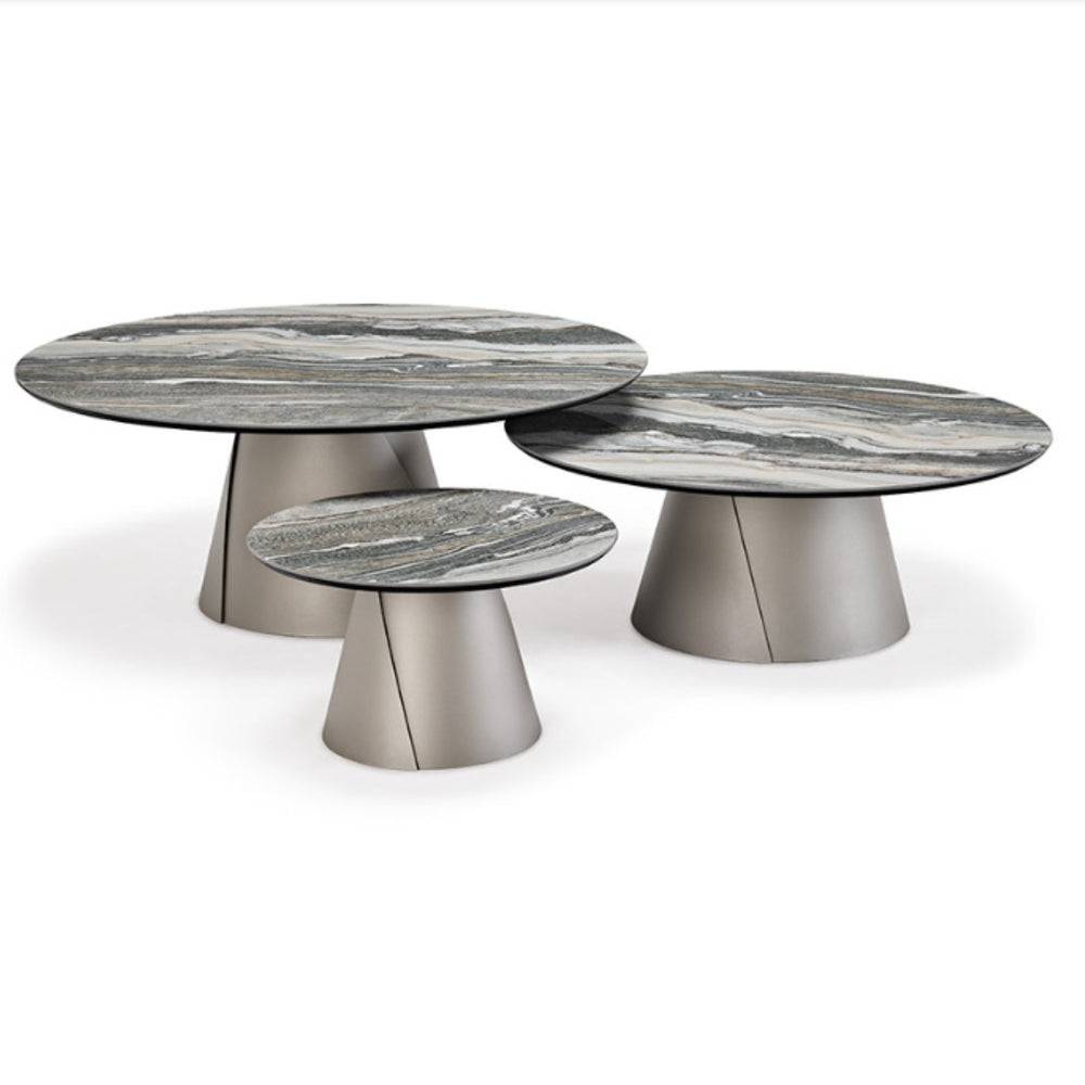 Tavolino ø118 x 38h cm con base in metallo goffrato titanio e piano in ceramica Kaindy| PRODOTTO ESPOSTO IN SHOWROOM